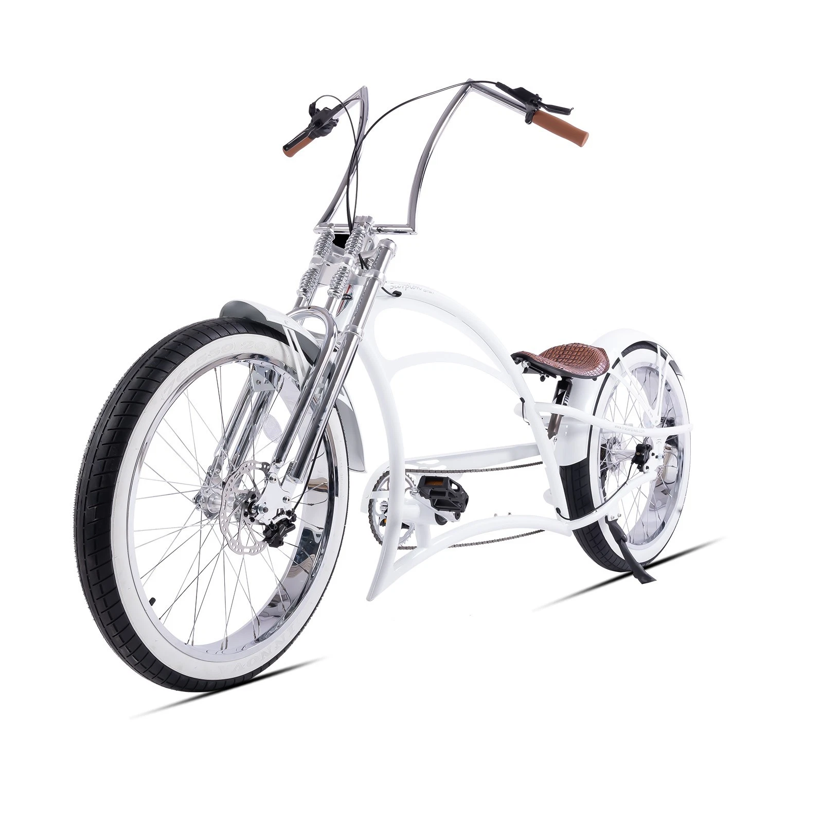 Designed for comfort, stability, and visual impact, the SCORPION GTS blends classic chopper aesthetics with modern riding components. The oversized steel frame provides a solid, grounded feel, while fat 26” tires absorb road imperfections for a smooth and relaxed ride.
